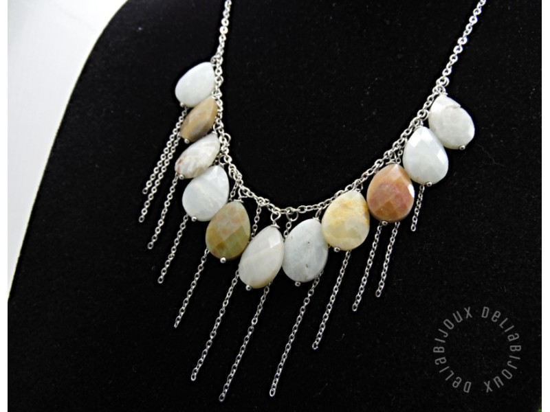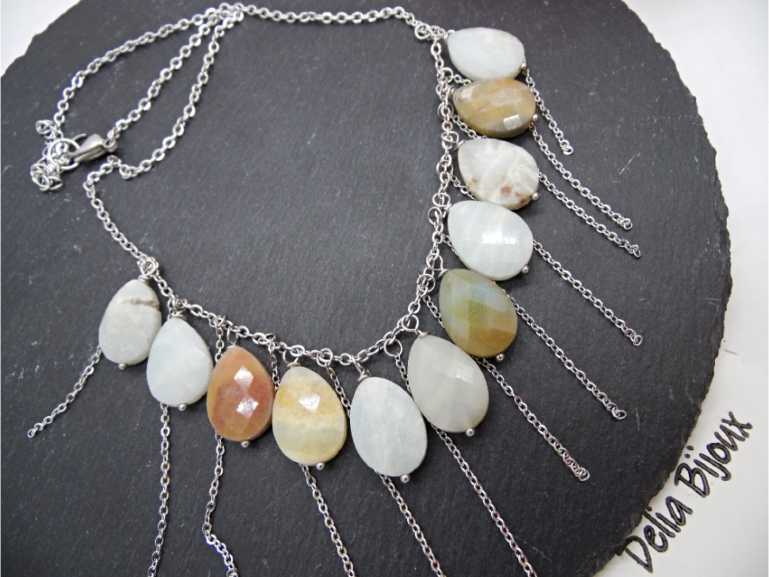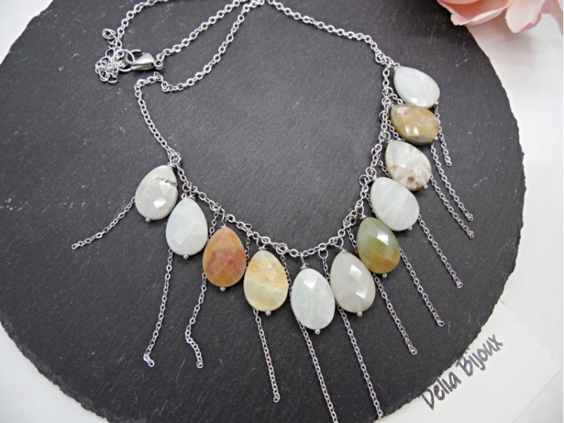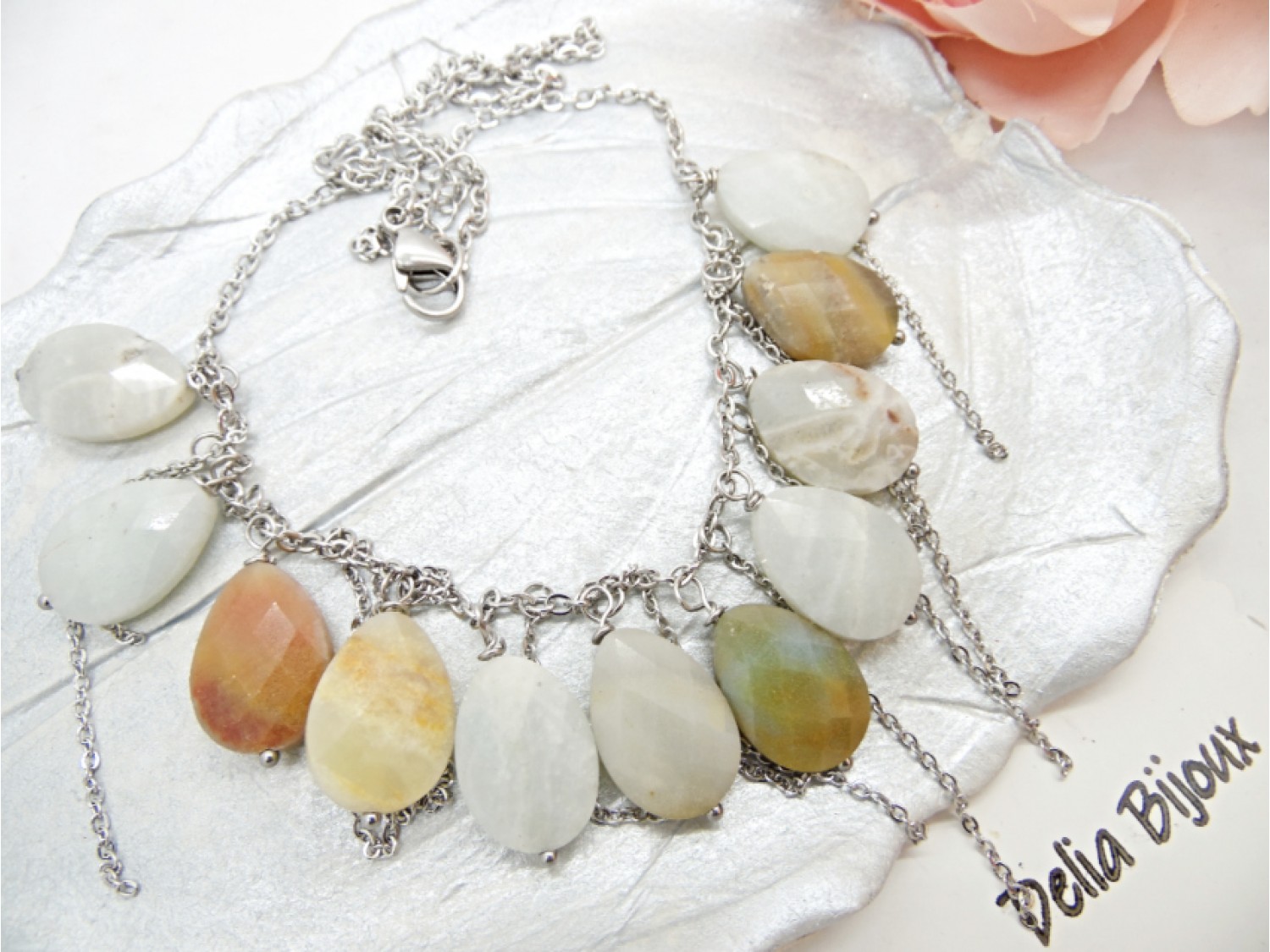 Colier handmade realizat din amazonite lacrimi fatetate ( 13 mm x 18 mm -> prezinta mici imperfectiuni naturale), elemente metalice si lant din otel inoxidabil. Inchidere tip lobster din otel inoxidabil.