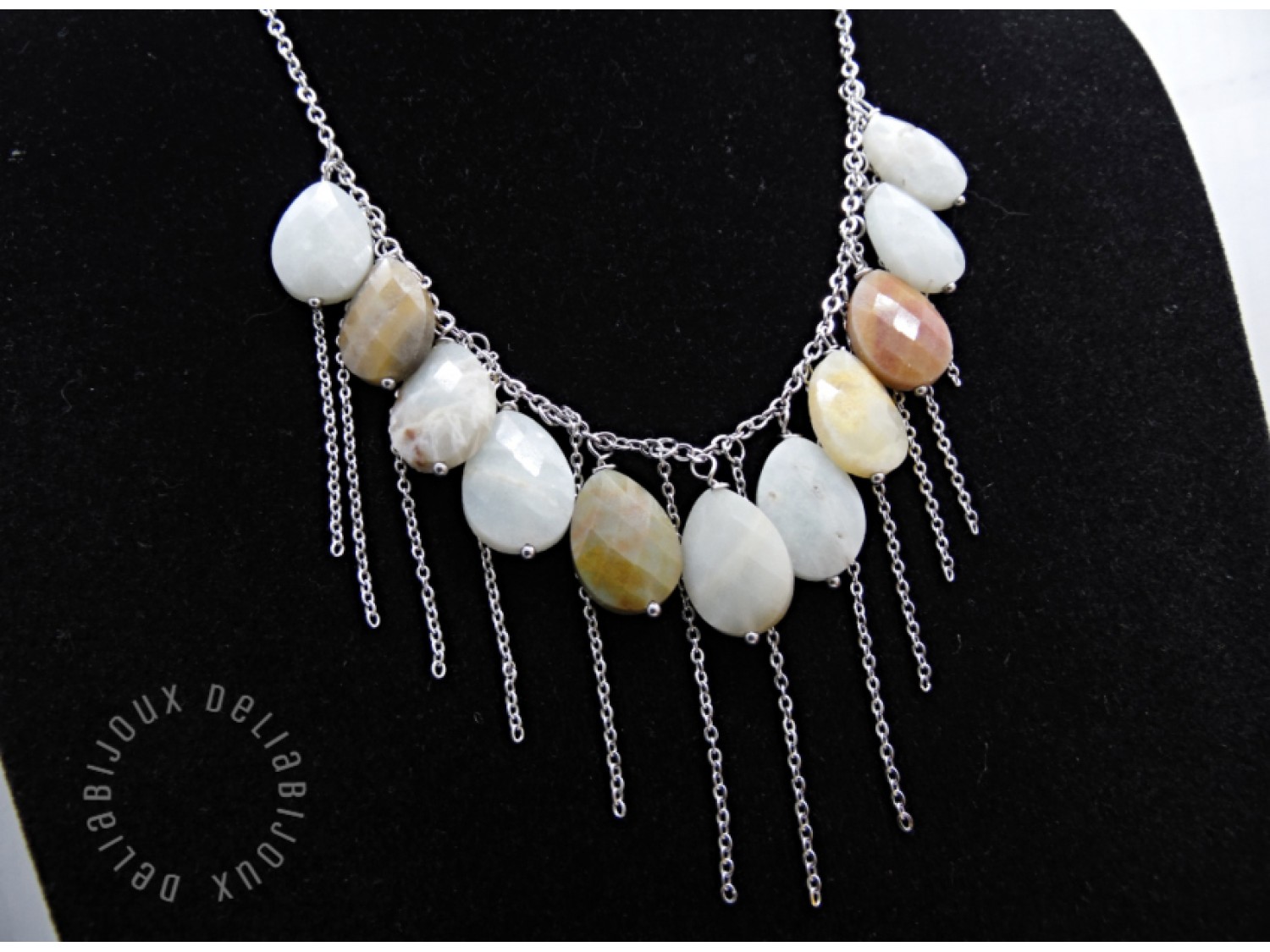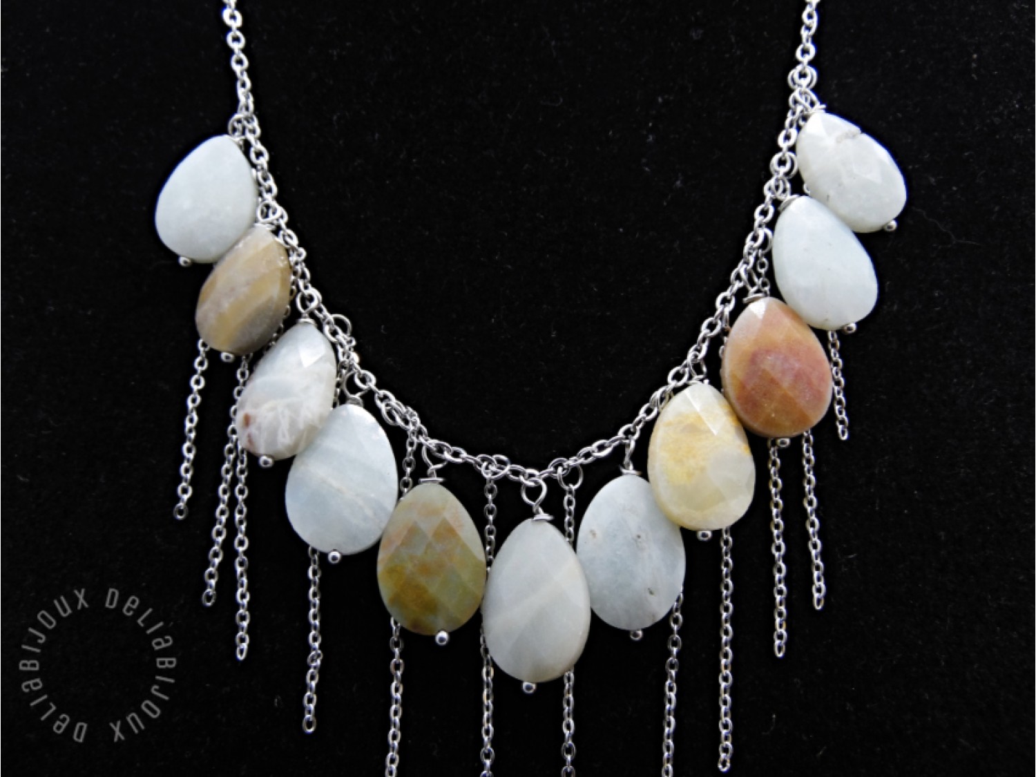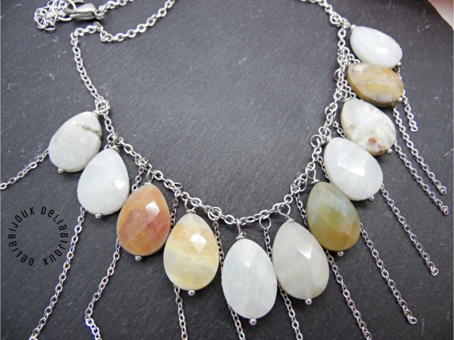 Colier handmade realizat din amazonite lacrimi fatetate ( 13 mm x 18 mm -> prezinta mici imperfectiuni naturale), elemente metalice si lant din otel inoxidabil. Inchidere tip lobster din otel inoxidabil.