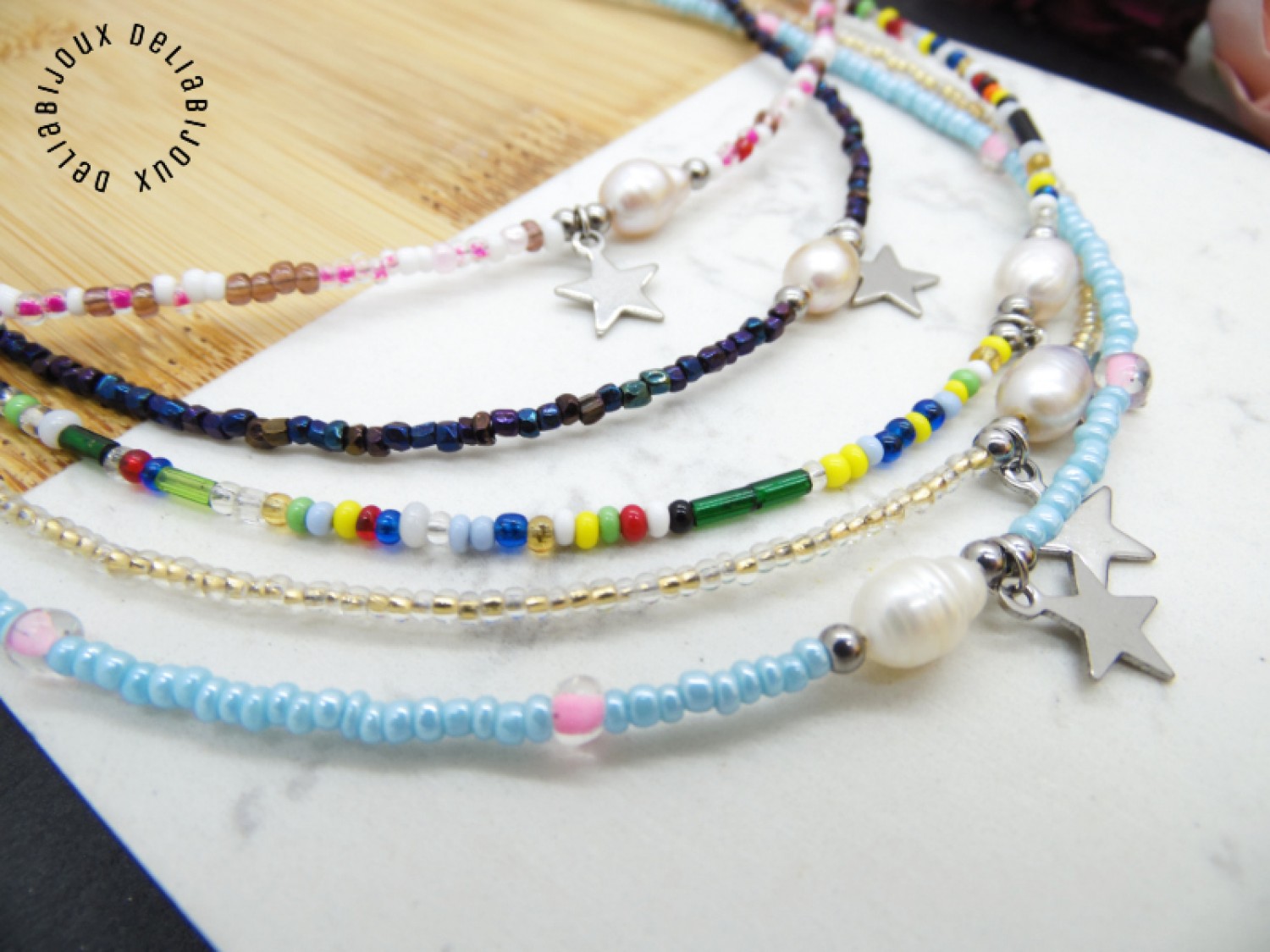 Colierul bleu si roz: Elegant și rafinat, acest colier este alcătuit din mărgele de sticlă roz si margele de nisip bleu, care reflectă lumina într-un mod delicat. Perla de cultură din centru se integrează armonios în paleta colierului, aducând o notă de puritate. Steaua din oțel inoxidabil, plasată langa perla, adaugă un contrast subtil și un strop de strălucire metalică.