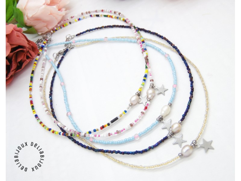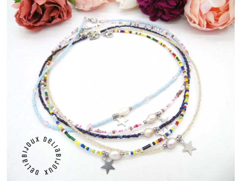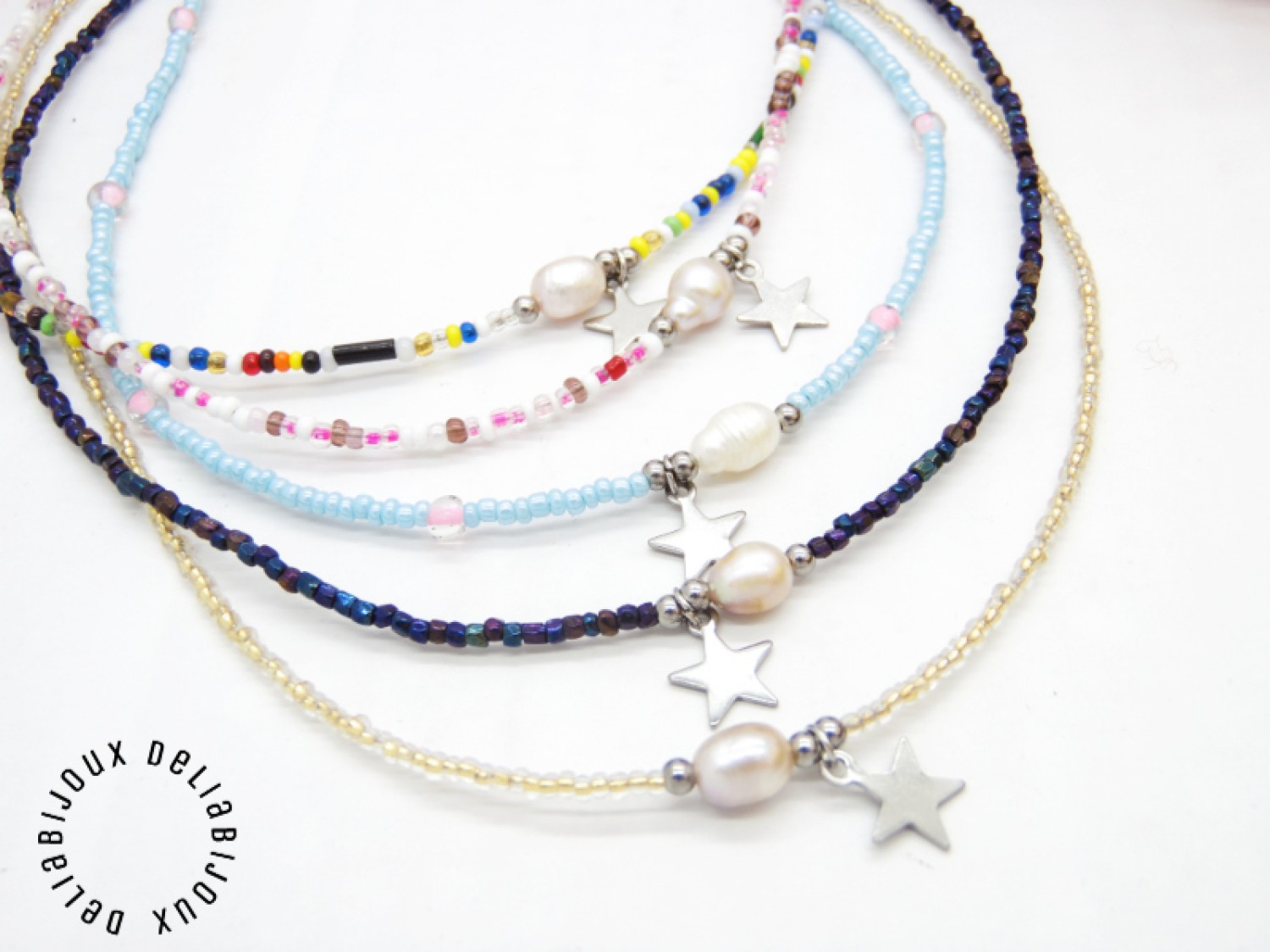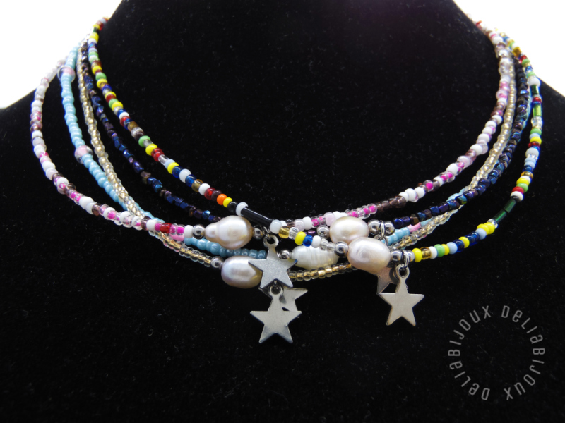 Coliere handmade, la baza gatului, usor asimetrice, realizate din perle de cultura naturale- forma neregulata (8~10 mm), bile otel inoxidabil (2 mm), steluta otel inoxidabil (10 mm), margele de nisip ( 2-4 mm), elemente metalice din otel inoxidabil. Inchidere tip lobster din otel inoxidabil.