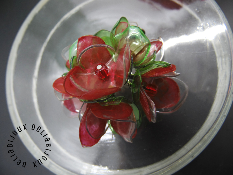 Inel statement cu flori realizate manual din PET-uri reciclate, este o bijuterie impresionantă ce emană o eleganță distinctivă și în același timp susține un mesaj puternic de durabilitate și reciclare.