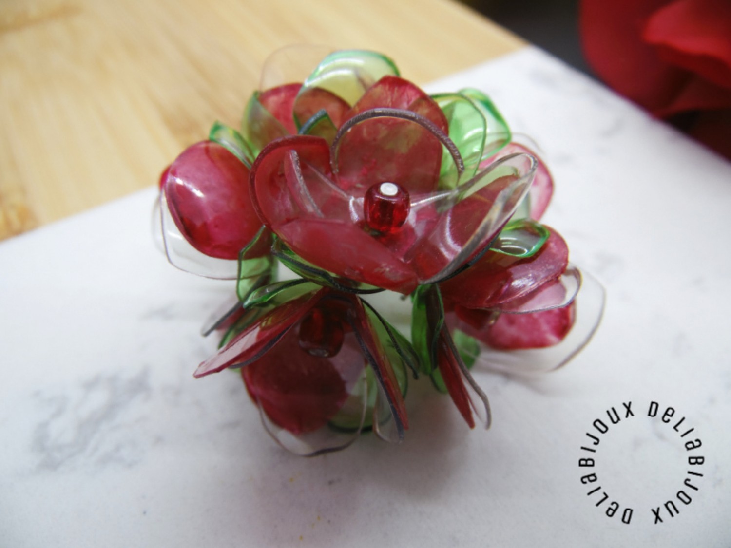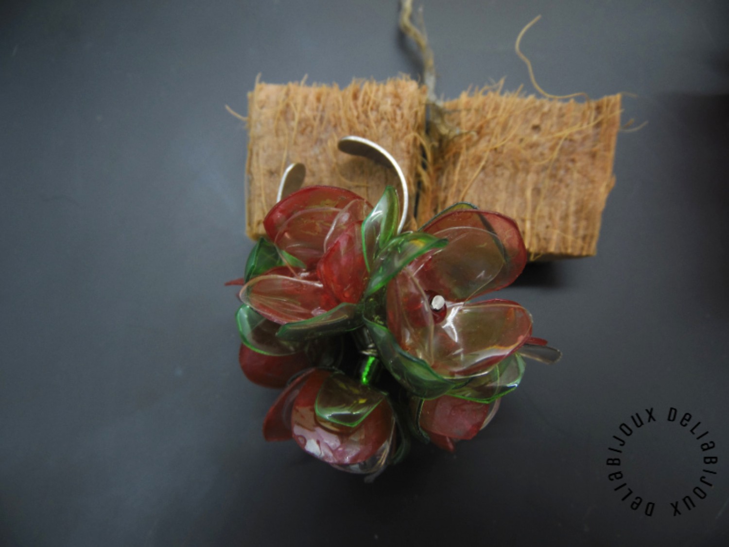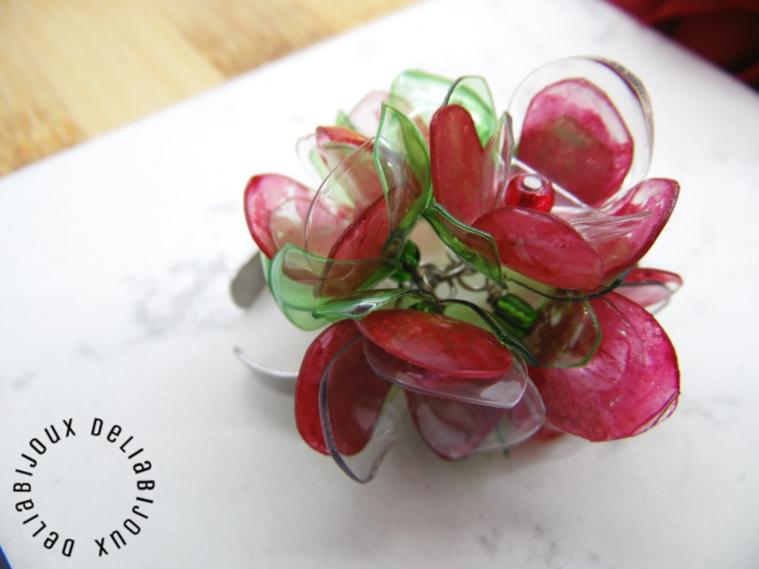 Florile delicate, modelate manual din PET-uri reciclate provenind din sticle de plastic de apa minerala, adaugă o notă de prospetime și originalitate cerceilor. Fiecare petală a fost atent modelată pentru a reda delicatețea și detaliile unui trandafir înflorit, conferind cerceilor un aspect tridimensional și elegant. Plasticul a fost vopsit cu culori acrilice, în nuanțe vibrante de roșu pentru flori, oferind un finisaj intens. Vopseaua acrilică are o textură aparte, cu urme vizibile de pensulă. Vopseaua nu este distribuită uniform, ceea ce adaugă un farmec autentic și artistic fiecărei piese. Vopseaua este durabilă și nu se șterge, însă se recomandă evitarea contactului cu apa si sapun, parfumuri sau alte substanțe chimice pentru a păstra aspectul intact.