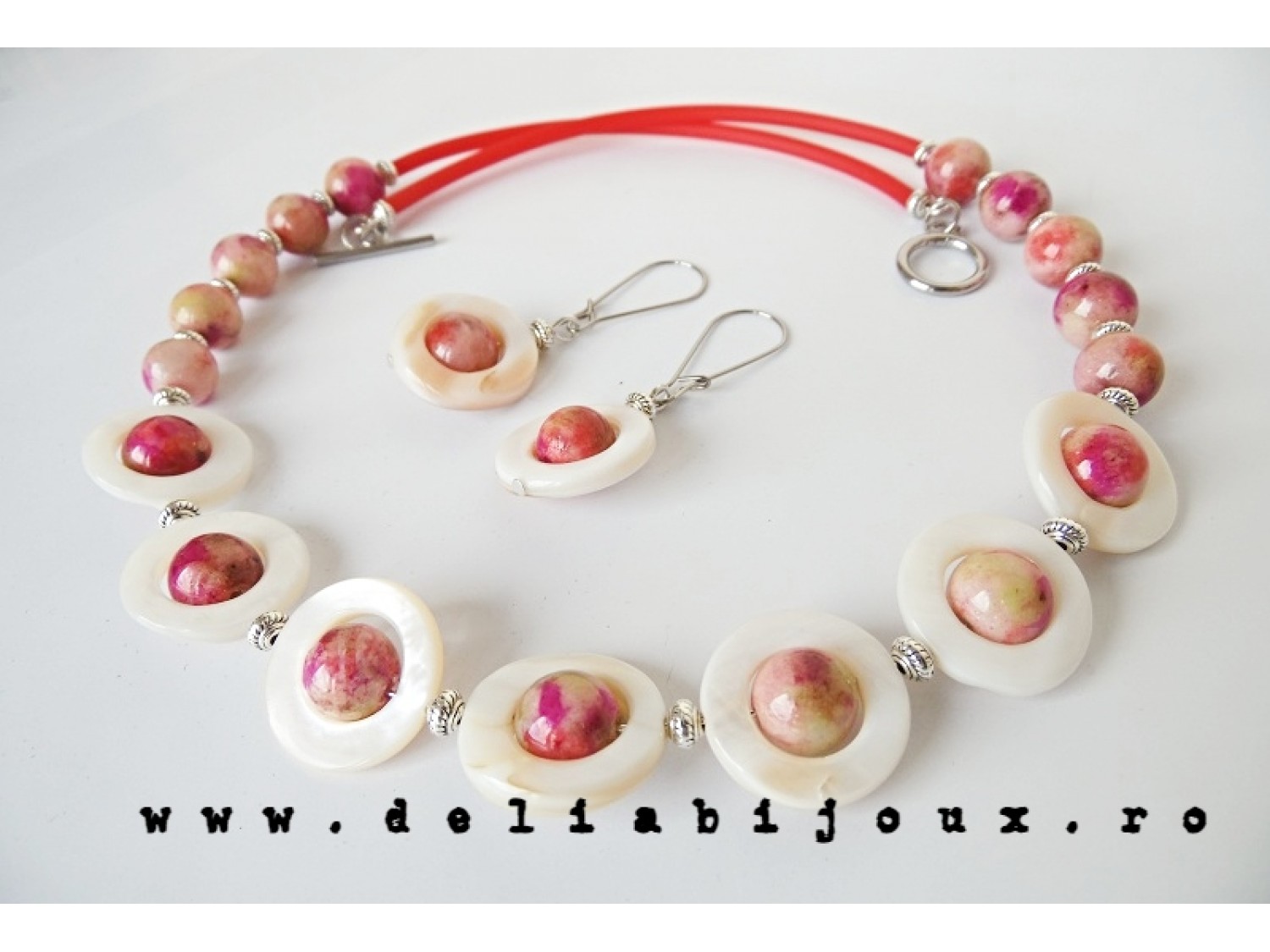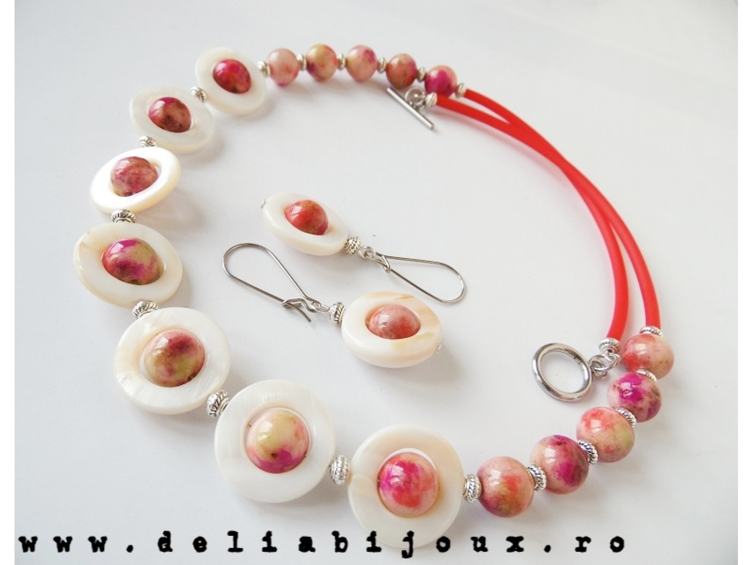 Set de bijuterii (colier si cercei) realizat din jad(10 mm), inele de sidef (20 mm), elemente metalice. Inchidere tip toggle din otel inoxidabil.