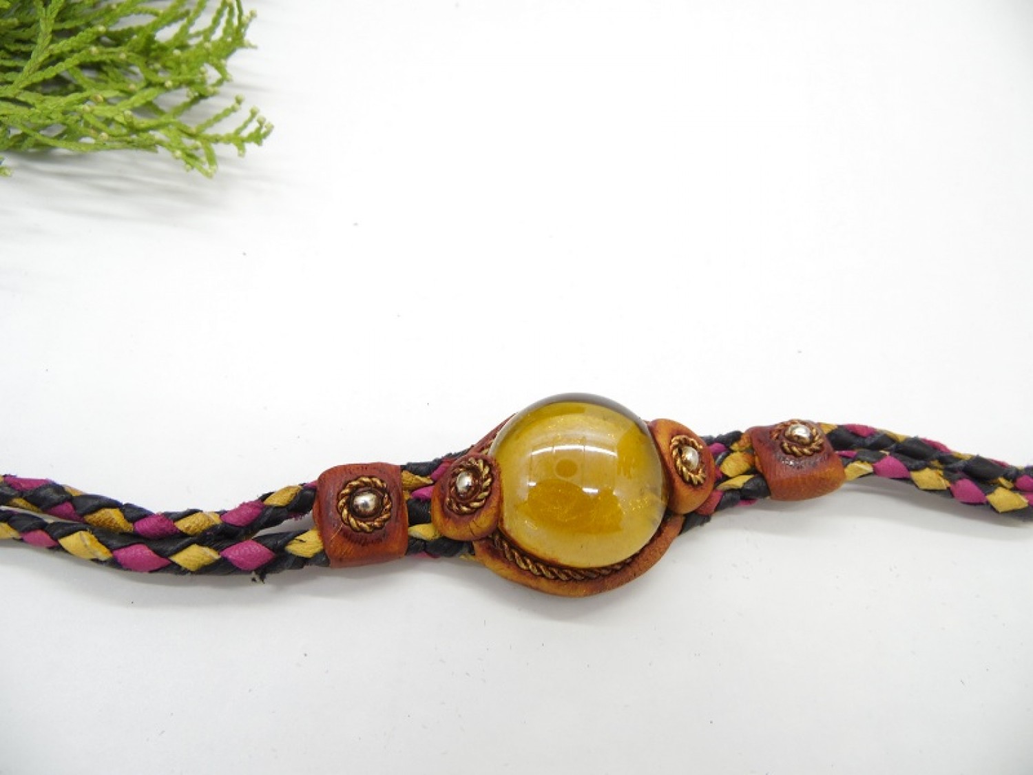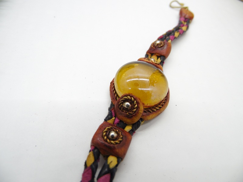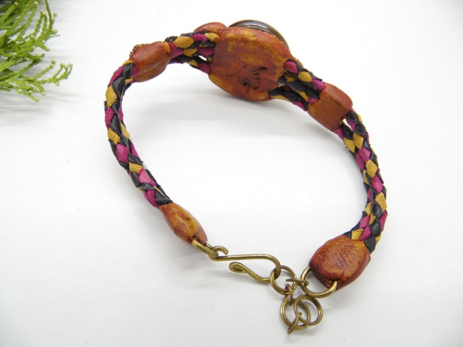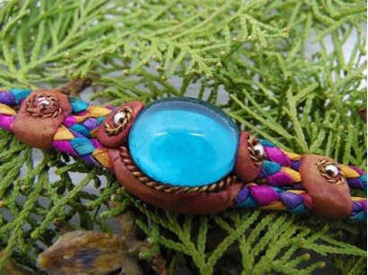 Bratara impletita din piele cu cristal de sticla colorata.Lungime = 17 cm + 2.5 cm lant prelungitor