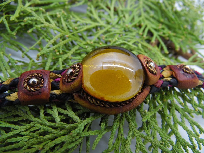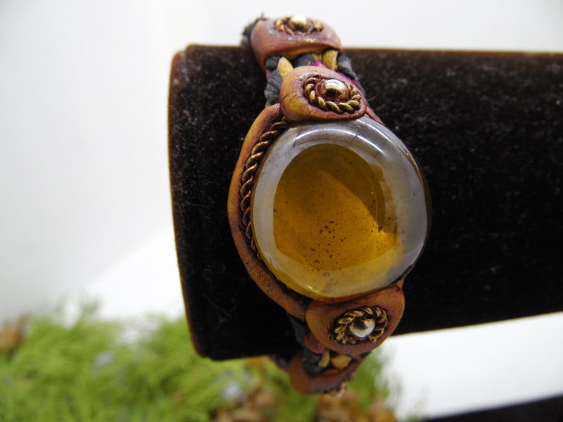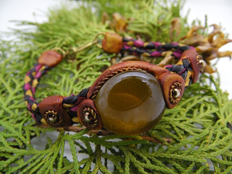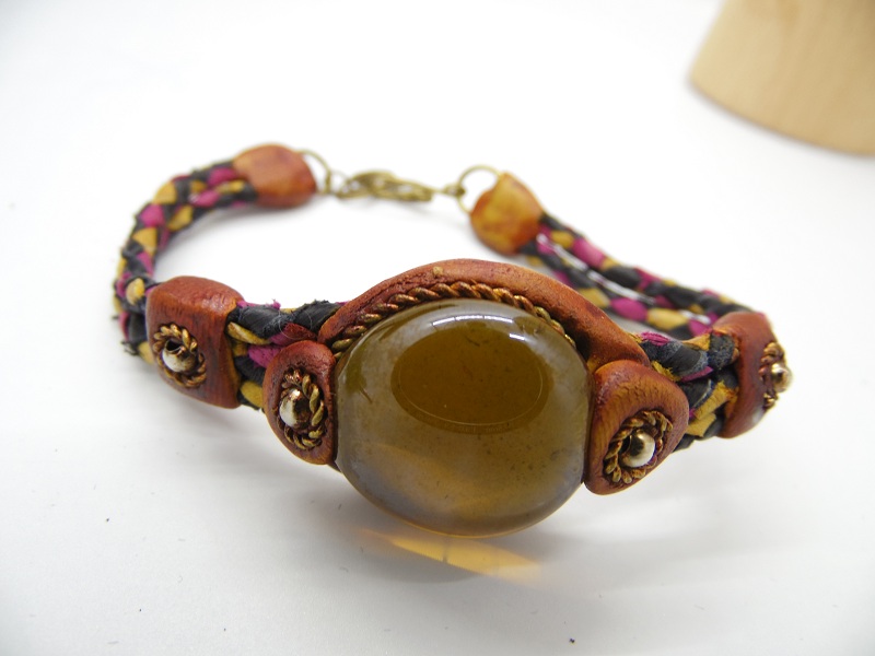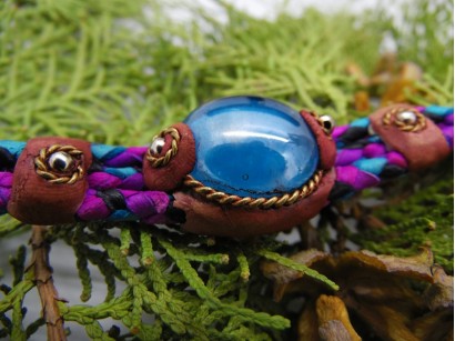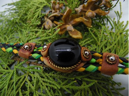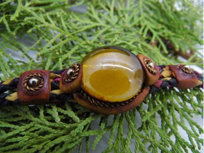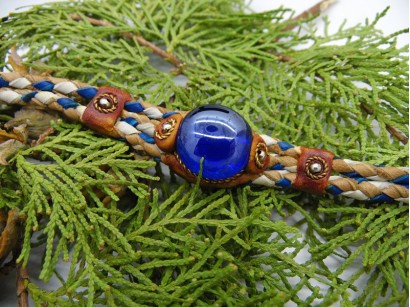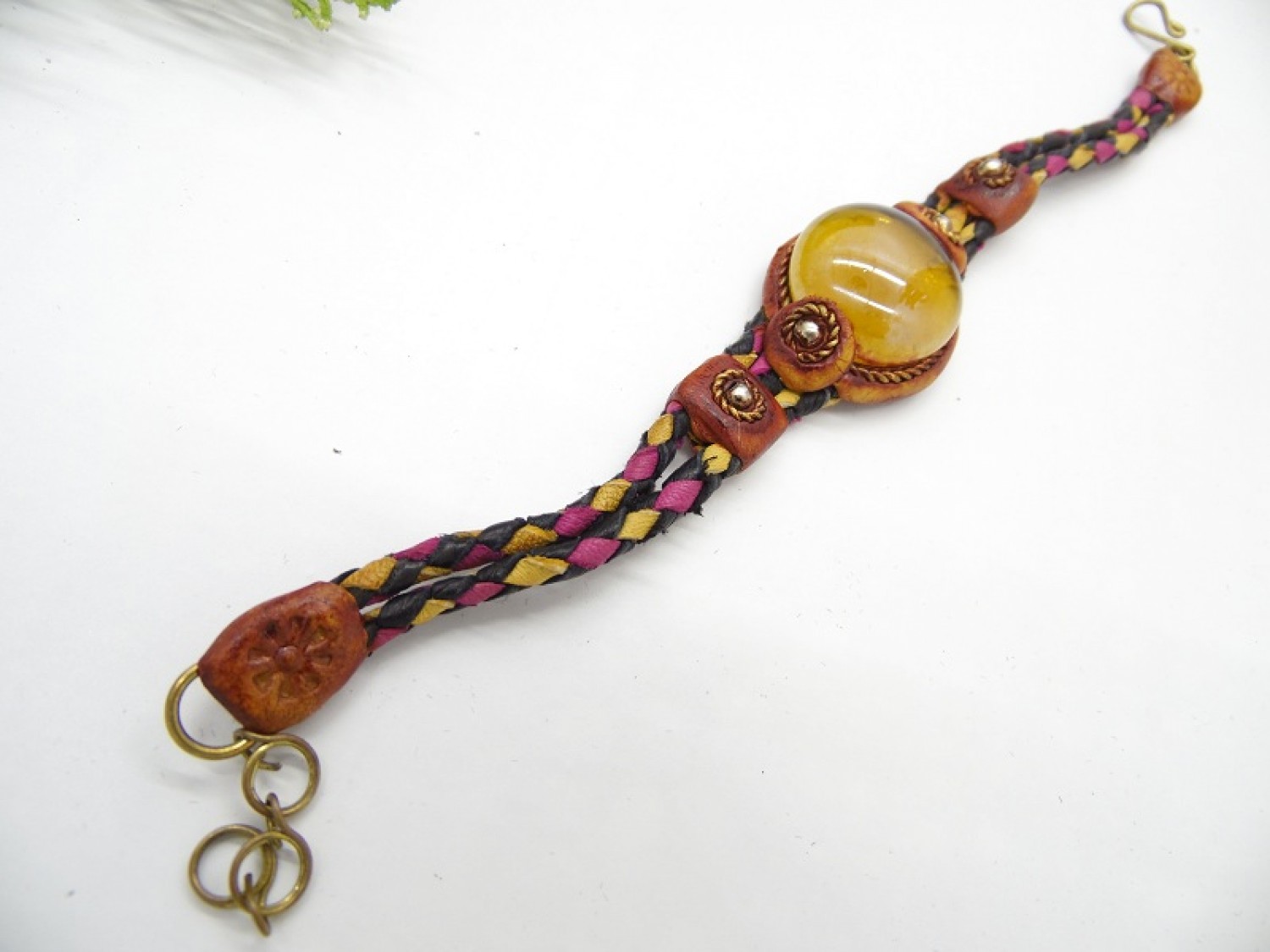 Bratara impletita din piele cu cristal de sticla colorata.Lungime = 17 cm + 2.5 cm lant prelungitor