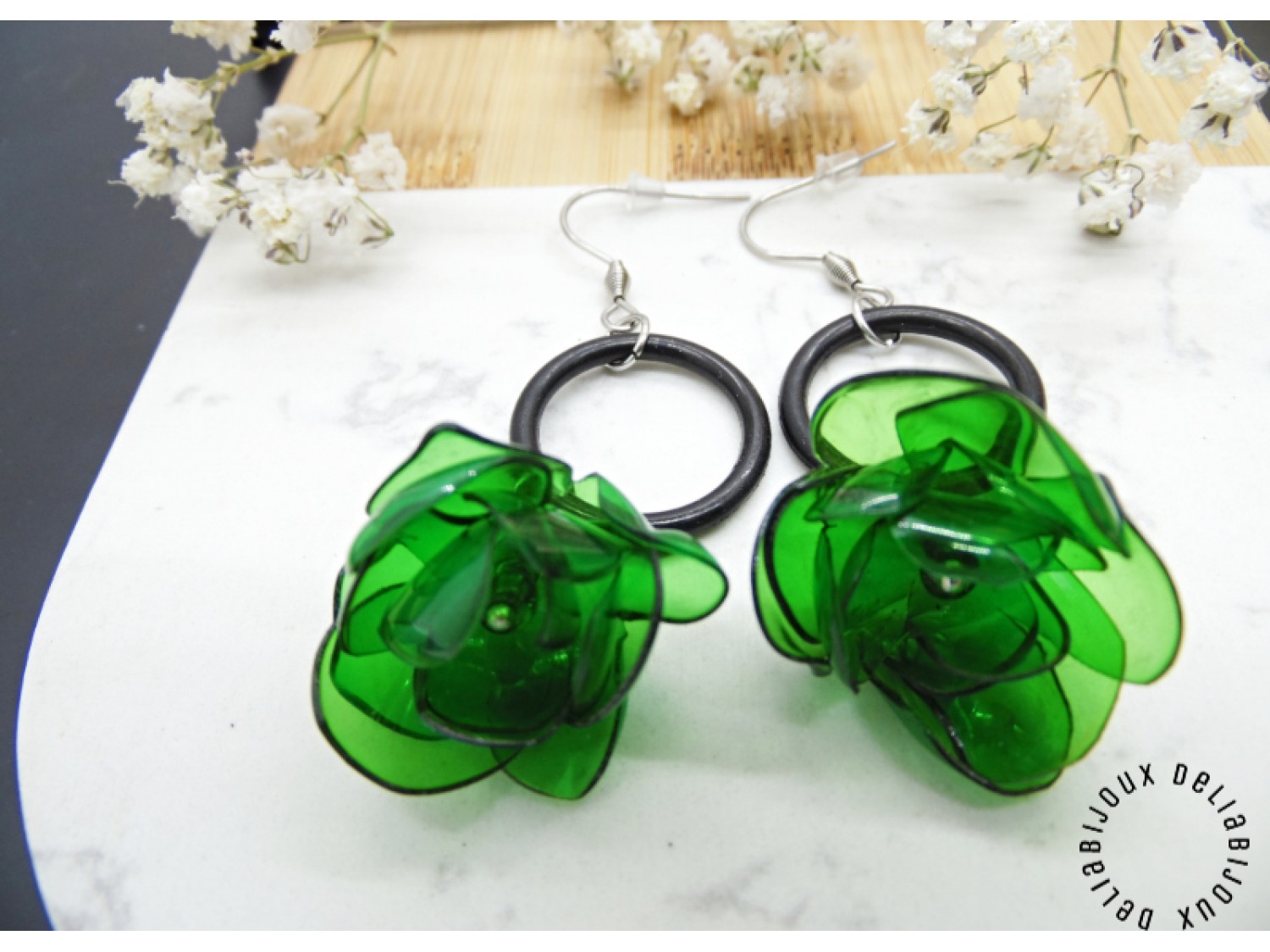 Fiecare floare a fost modelată cu grijă din plastic reciclat, iar garniturile de cauciuc adaugă un accent neașteptat, transformând aceste accesorii într-o declarație de stil și sustenabilitate.