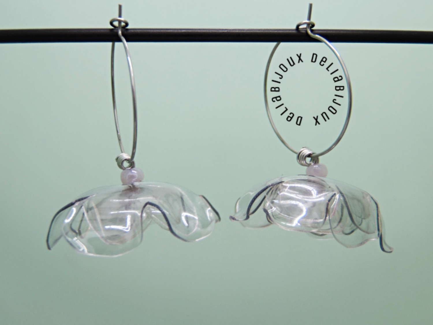 Cercei handmade statement, model contemporan, foarte usori si versatili, realizati din plastic reciclat (PET-uri decupate si modelate in diverse forme - diametrul florilor intre 3 cm - 3.2 cm - florile nu sunt identice), margele de nisip (3 mm) si elemente metalice.