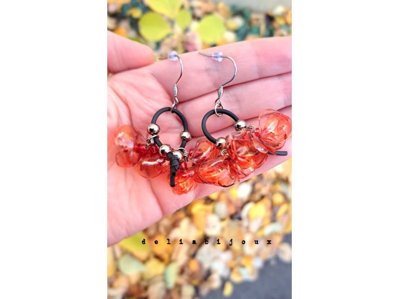 Cercei statement unici, realizați handmade din materiale reciclate, ideali pentru iubitoarele de accesorii eco-friendly! Baza din tub de cauciuc negru susține un buchet de flori roșii spectaculoase, create din sticle de plastic reciclate, vopsite manual cu vopsea pe bază de alcool pentru un finisaj vibrant. Vopseaua nu este distribuită uniform, ceea ce adaugă un farmec autentic și artistic fiecărei piese. Vopseaua este durabilă și nu se șterge, însă se recomandă evitarea contactului cu parfumuri sau alte substanțe chimice pentru a păstra aspectul intact.