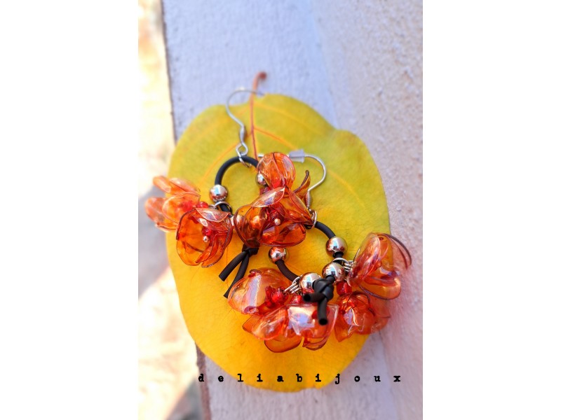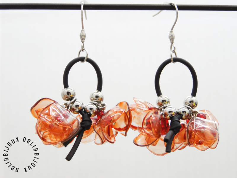 Cercei handmade statement, foarte usori si versatili, usor asimetrici, realizati din plastic reciclat (PET-uri decupate si modelate in diverse forme - diametrul florilor aprox 1.5 cm - 2 cm, florile nu sunt identice), margele de nisip (3 mm), tub negru silicon, bile inox (6 mm) si elemente metalice din otel inoxidabil.