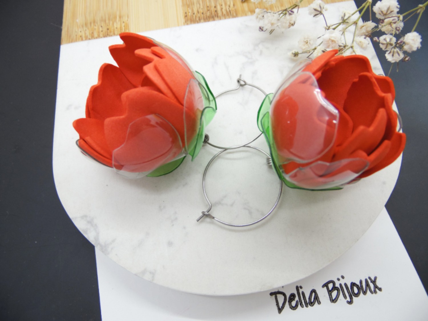 Floarea centrală, modelată cu migală din foamiran roșu intens, este decorată cu o mărgea de nisip roșie amplasată în centru. Deasupra, o floare delicată, sculptată manual din sticlă de plastic transparentă reciclată, adaugă un strat fascinant de textură și strălucire. Complementează designul o frunză modelattă din sticlă de plastic verde, decorată cu o mărgea fină de nisip verde, pentru un efect natural, dar modern.