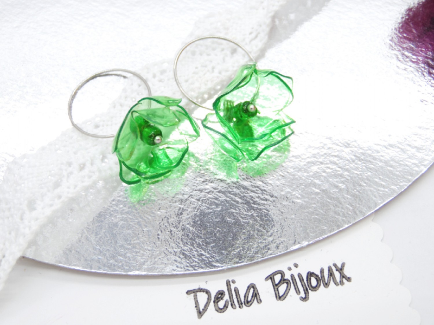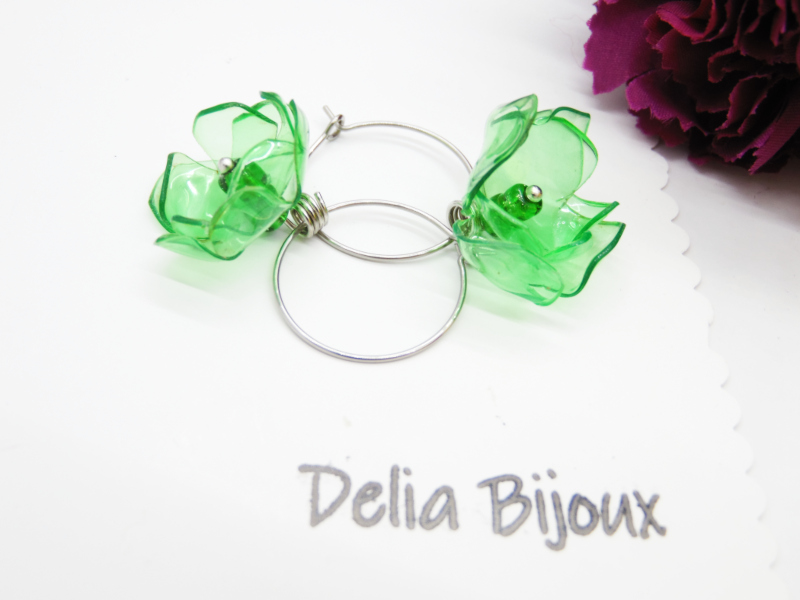 Acești cercei unici sunt creați din sticle de plastic reciclate, modelate cu grijă în forme delicate de flori. Fiecare petală, realizată în nuanțe translucide de verde, captează lumina cu un efect subtil de strălucire, adăugând un aer proaspăt și vibrant accesoriilor. Cerceii sunt ușori și confortabili, ideali pentru a adăuga o notă sustenabilă și creativă oricărei ținute.