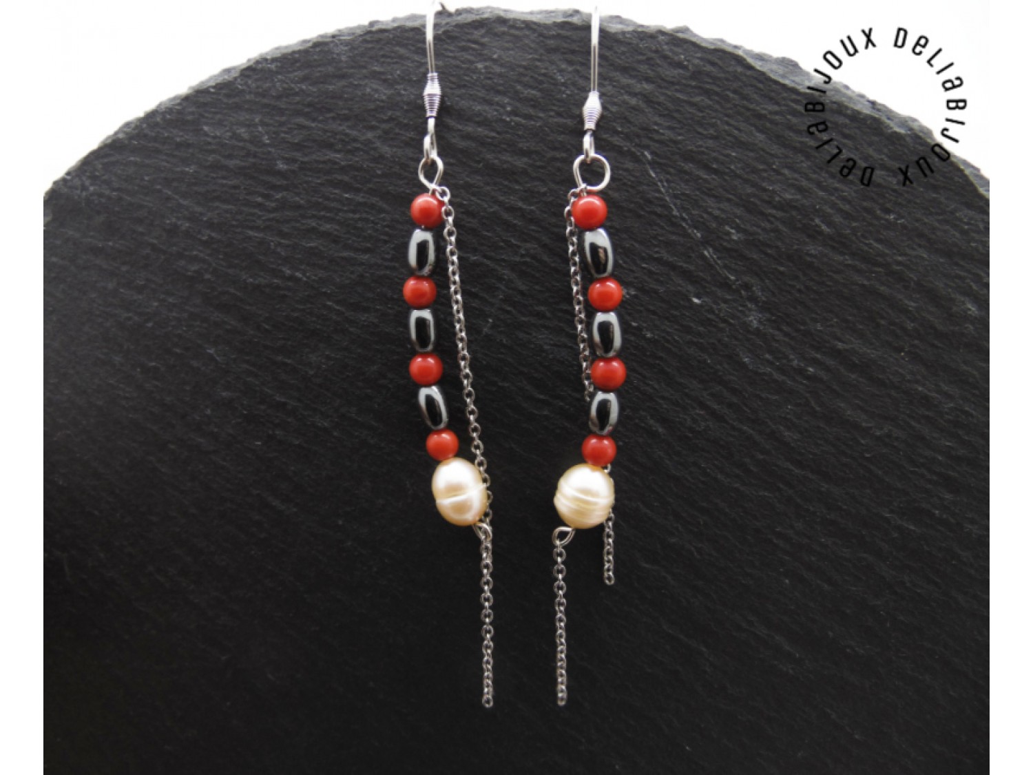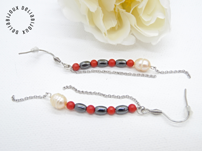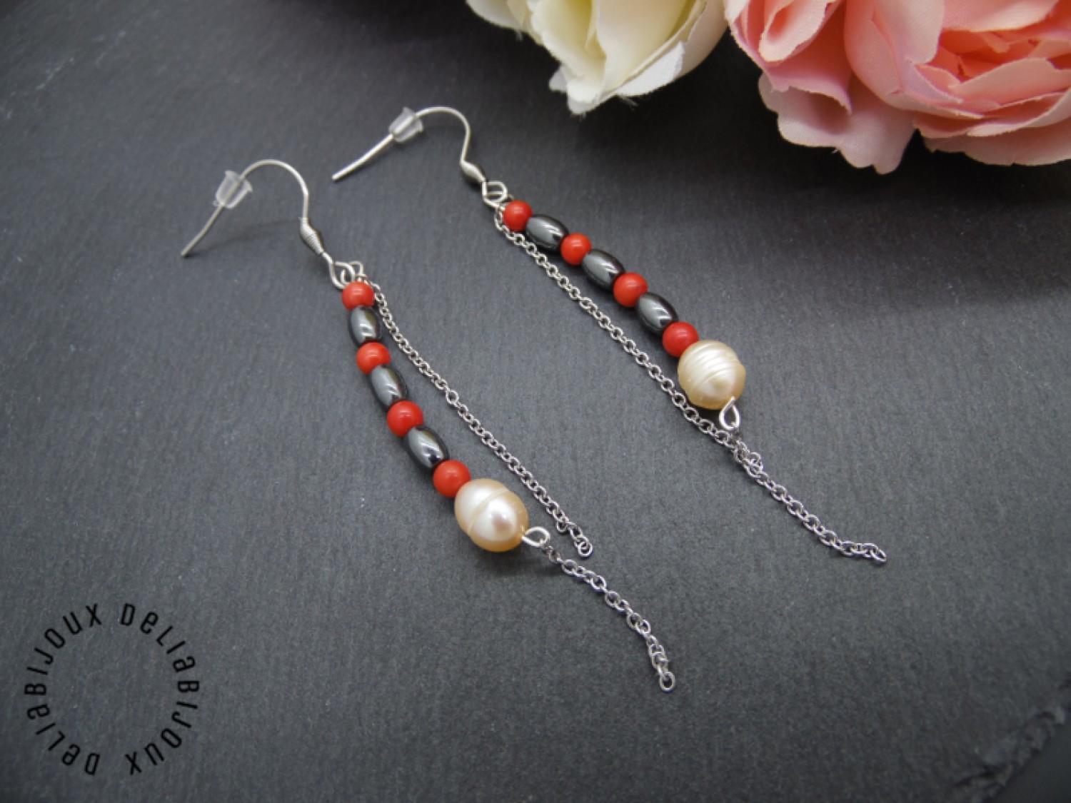 Cercei handmade realizati din perle de cultura (20 cm), coral (4 mm), hematit bob orez ( 6 x 4 mm), tortite din otel inoxidabil, elemente metalice si dopuri de silicon.