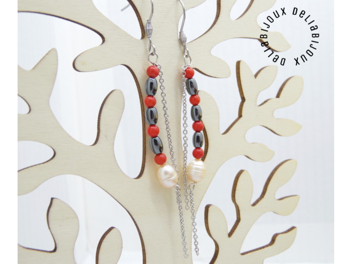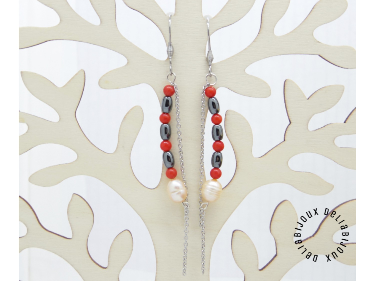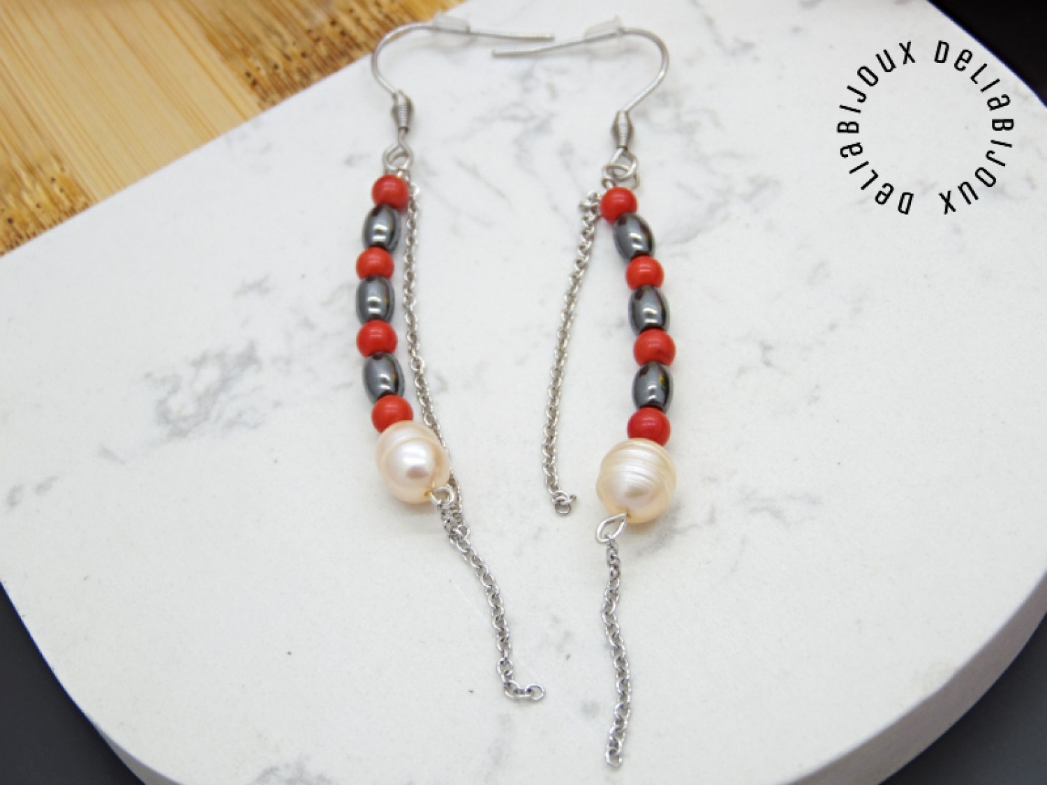 Această pereche de cercei handmade emană o eleganță naturală și o simplitate rafinată, fiind realizată dintr-o combinație minunată de perle de cultură, coral, hematit și lanț din oțel inoxidabil.