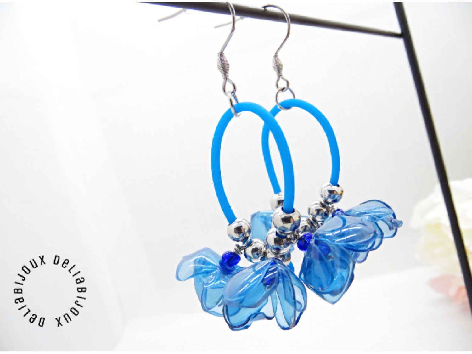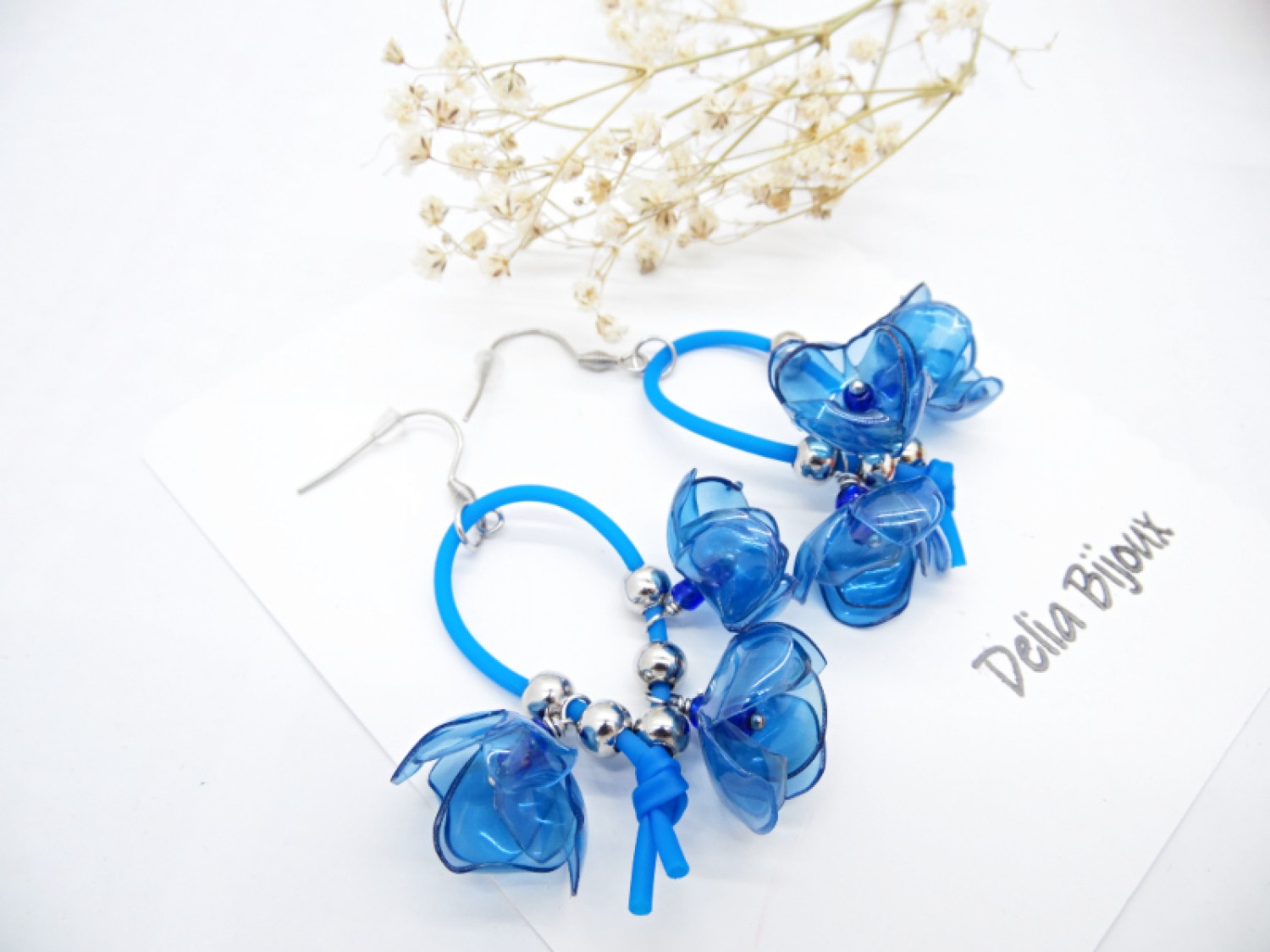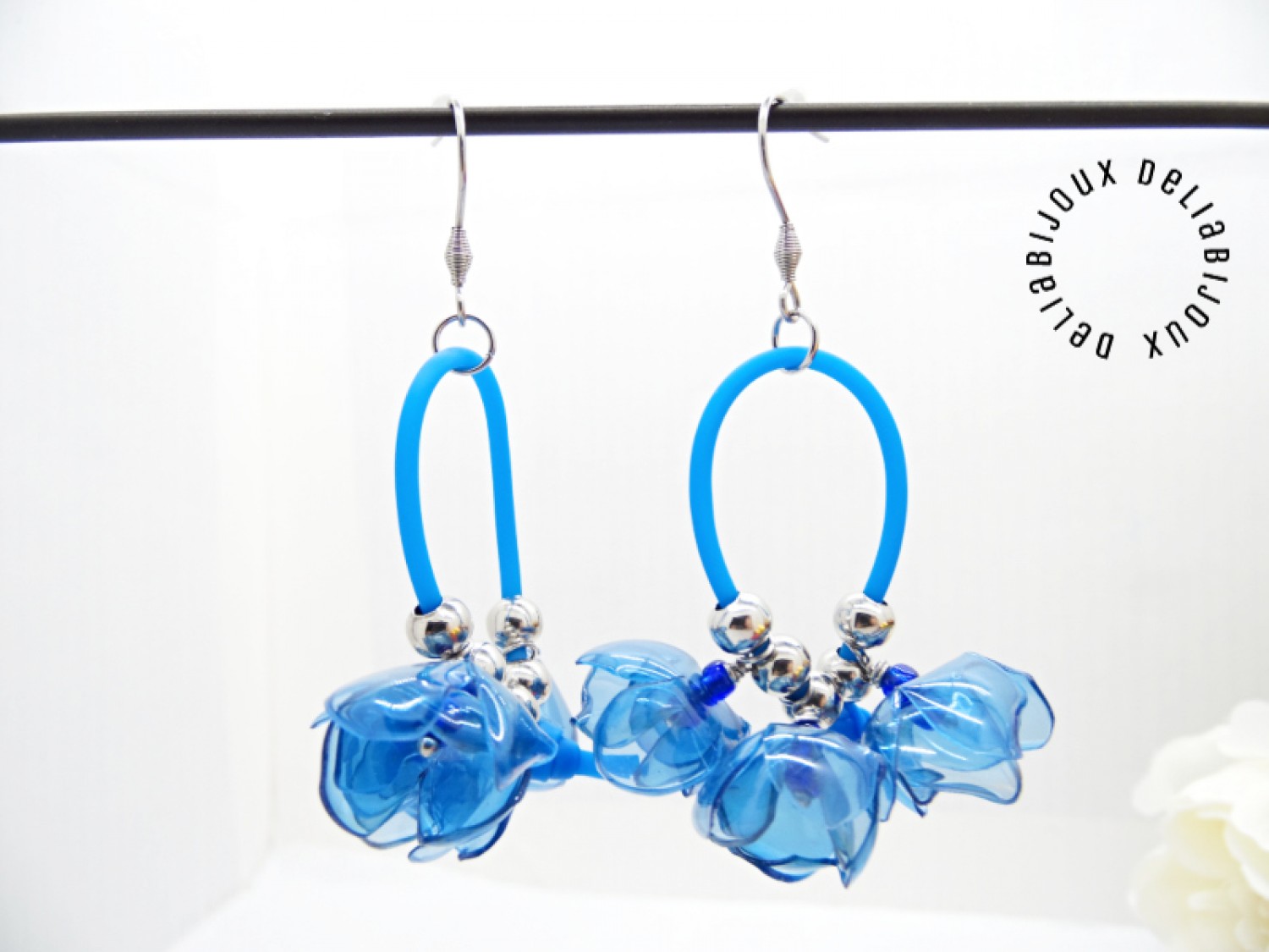 Fiecare petală are un aspect translucid, asemănător sticlei, dar cerceii sunt extrem de ușori și confortabili de purtat. Florile sunt suspendate cu eleganță de un șnur subțire de silicon albastru, care oferă un contrast modern și subliniază frumusețea materialelor refolosite. In mijlocul fiecarei flori se afla o margea delicata de nisip, pentru un plus de detaliu.