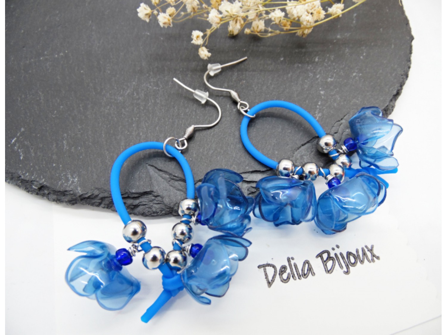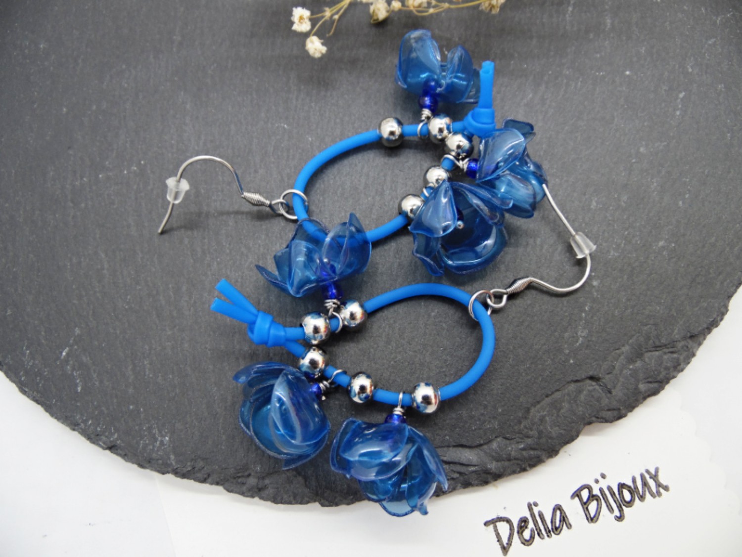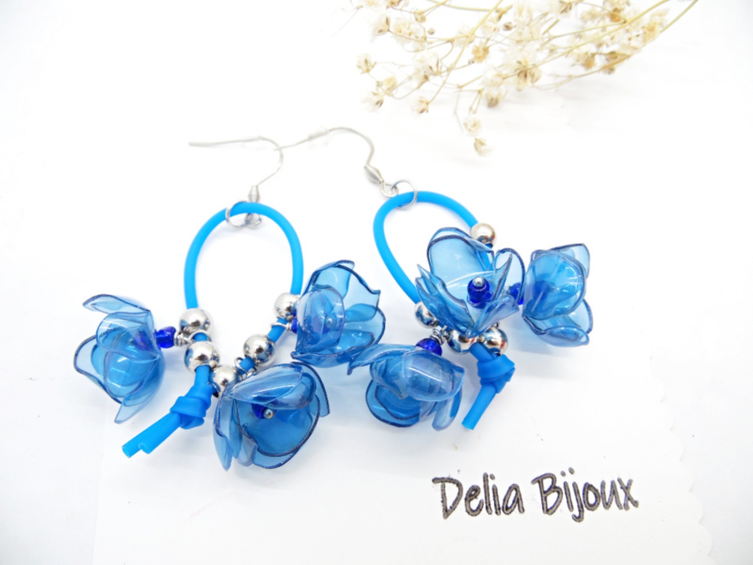 Fiecare petală are un aspect translucid, asemănător sticlei, dar cerceii sunt extrem de ușori și confortabili de purtat. Florile sunt suspendate cu eleganță de un șnur subțire de silicon albastru, care oferă un contrast modern și subliniază frumusețea materialelor refolosite. In mijlocul fiecarei flori se afla o margea delicata de nisip, pentru un plus de detaliu.