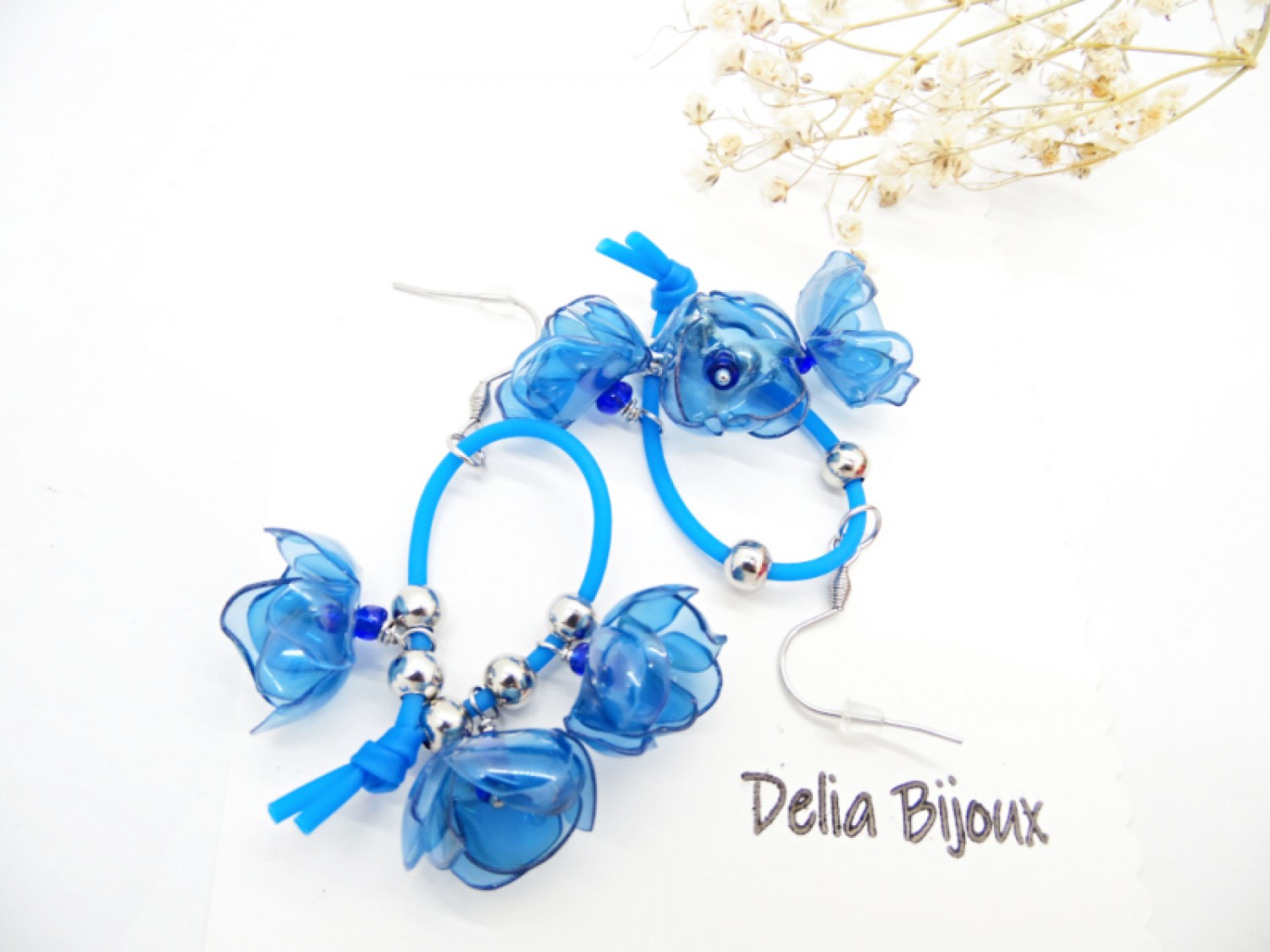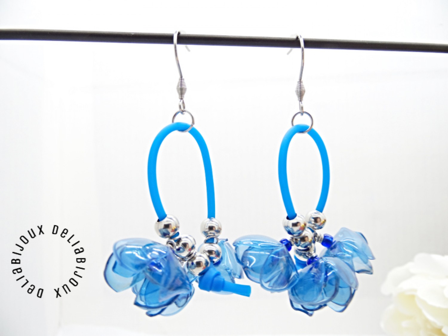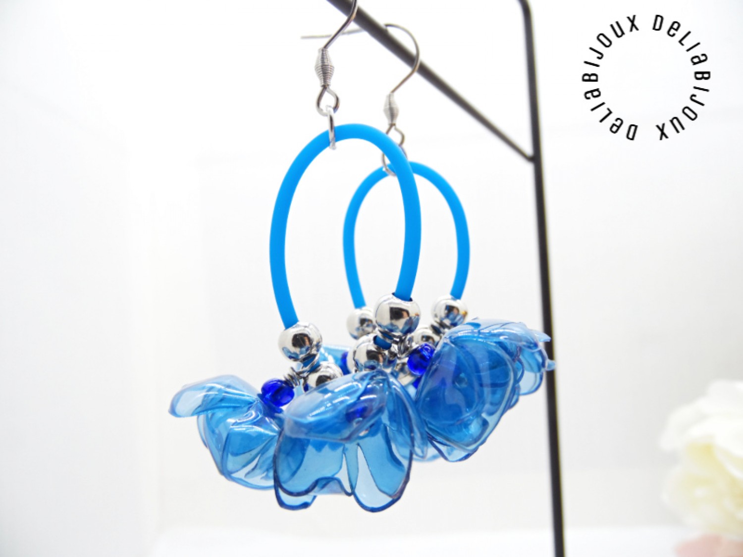 Atrage toate privirile cu această pereche de cercei statement handmade, creați manual din sticle PET reciclate, tăiate și modelate cu grijă sub forma unor flori albastre, delicate, cu un design modern si eco-friendly.