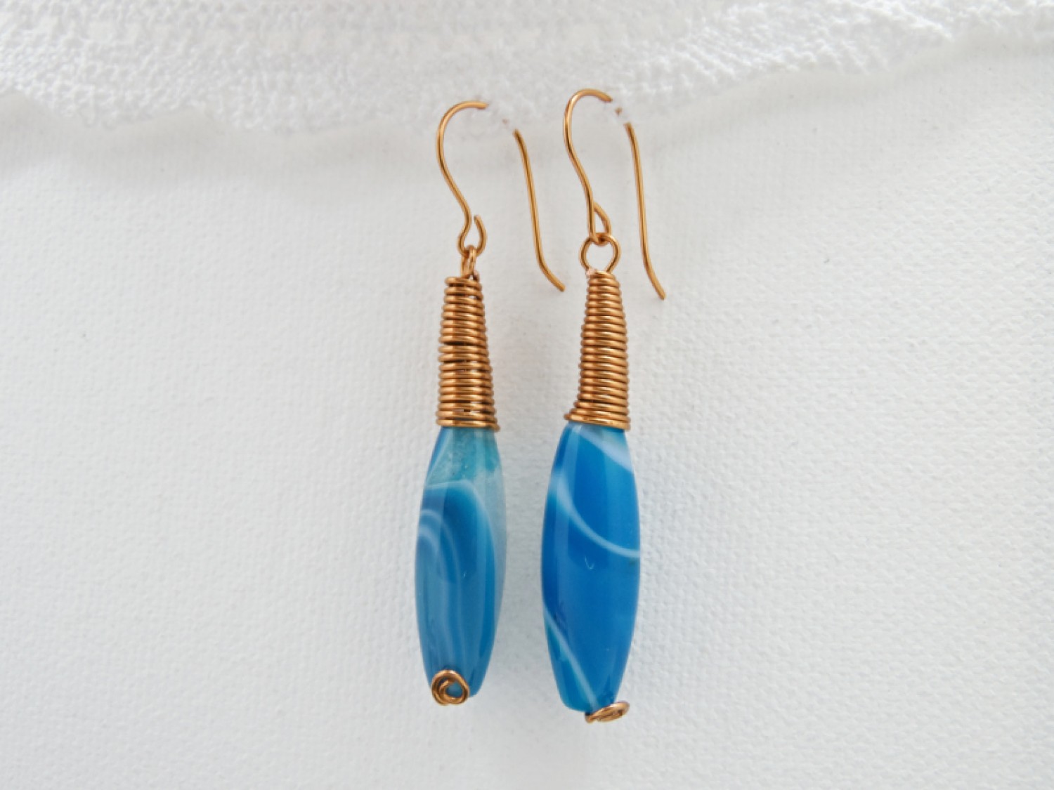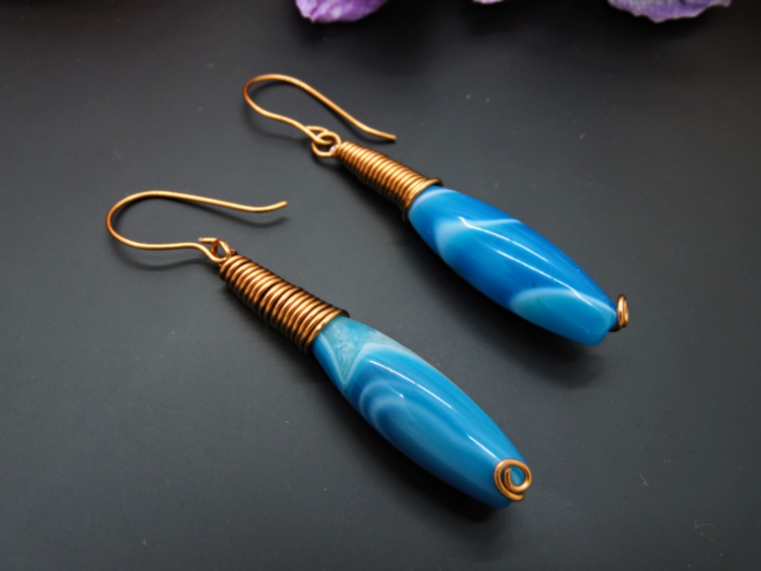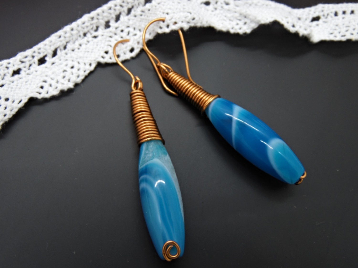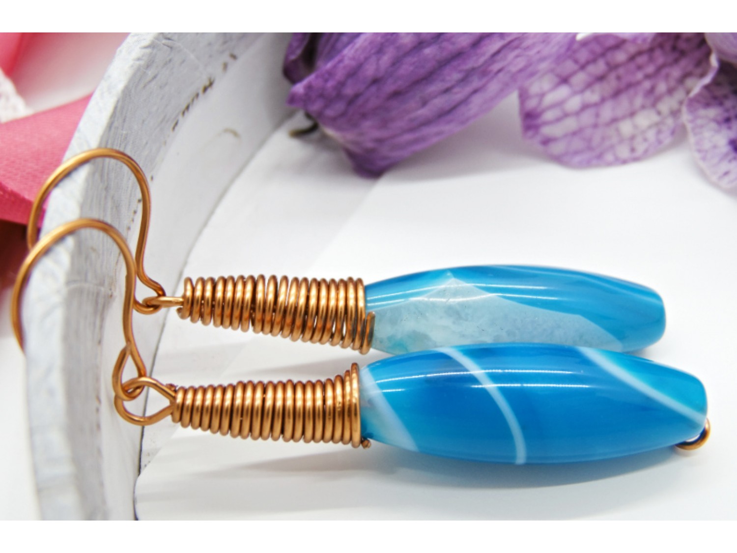 Sârma de cupru a fost modelată manual pentru a crea un arc pentru fiecare piatră. Acest lucru accentuează frumuseţea naturală a agatei şi îi oferă un aspect modern şi elegant.