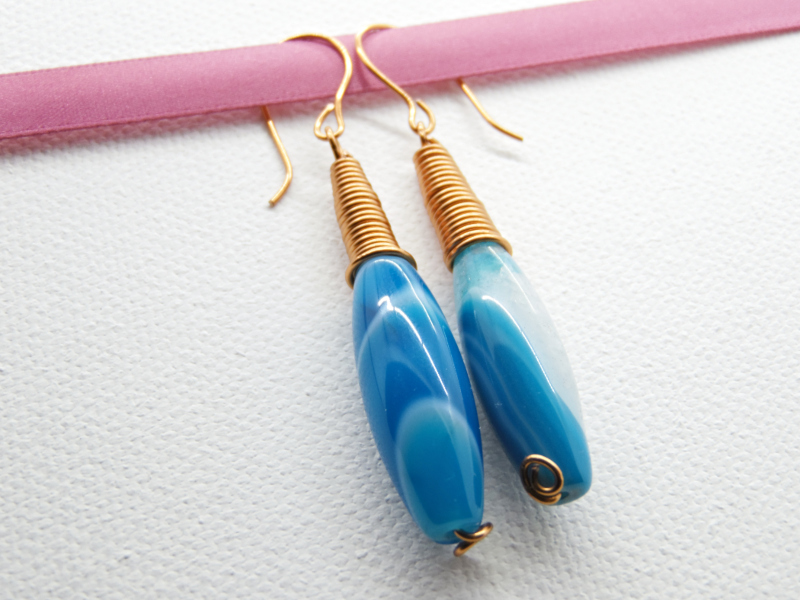 Cercei handmade unicat realizati manual din sarma de modelaj cupru non-tarnish (nu oxideaza, nu se pateaza si nu isi pierde aspectul initial ->grosime 0.8 mm) si agate bob de orez (29 ~30 mm x 10 mm ->nu sunt perfect identice, din aceasta cauza cerceii sunt usor asimetrici). Tortitele sunt de asemenea, lucrate manual, in acelasi ton cu cerceii.
