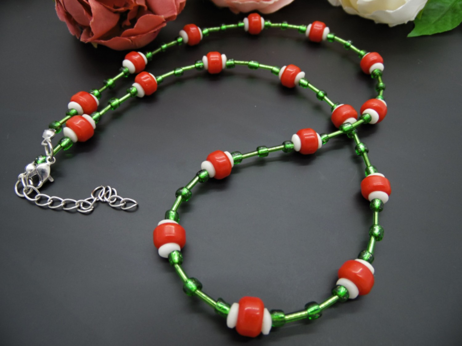 Colier handmade, realizat din margele de sticla (8 mm), margele de nisip cu foita (4 mm), margele de nisip tubulare (6 mm), discuri de plastic (6 mm), elemente metalice. Inchidere tip lobster. Lungimea colierului -> 59 cm + 5 cm prelungire